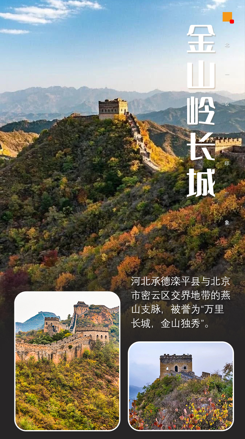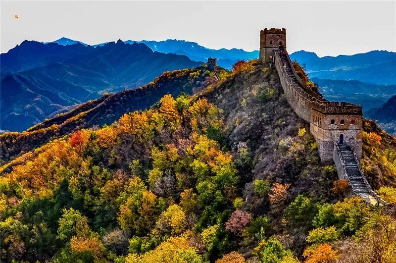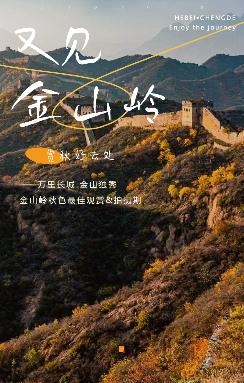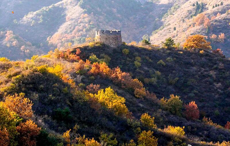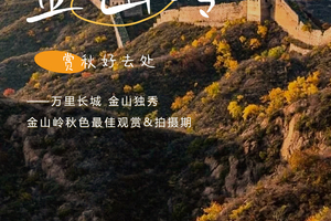 金山岭长城位于河北省承德市滦平县境内,与北京市密云县相邻,由明朝爱国将领戚继光担任蓟镇总兵官时期(1569年-1582年)主持修筑,是万里长城的精华地段。西起龙峪口,东至望京楼,全长10.5公里,沿线遍布关隘、敌楼、烽火台。站在将军楼、大小金山楼等高点远望,目光所及的巍巍群山之巅皆有长城蜿蜒,非常壮观。央视每天早上播出的《国歌》中的长城画面就取景于此。每年十月中旬到十一月上旬,漫山遍野的黄栌、枫叶、火炬树等开始变幻出红的、黄的、橙的颜色,为古老的长城添上一抹秋日斑斓。
