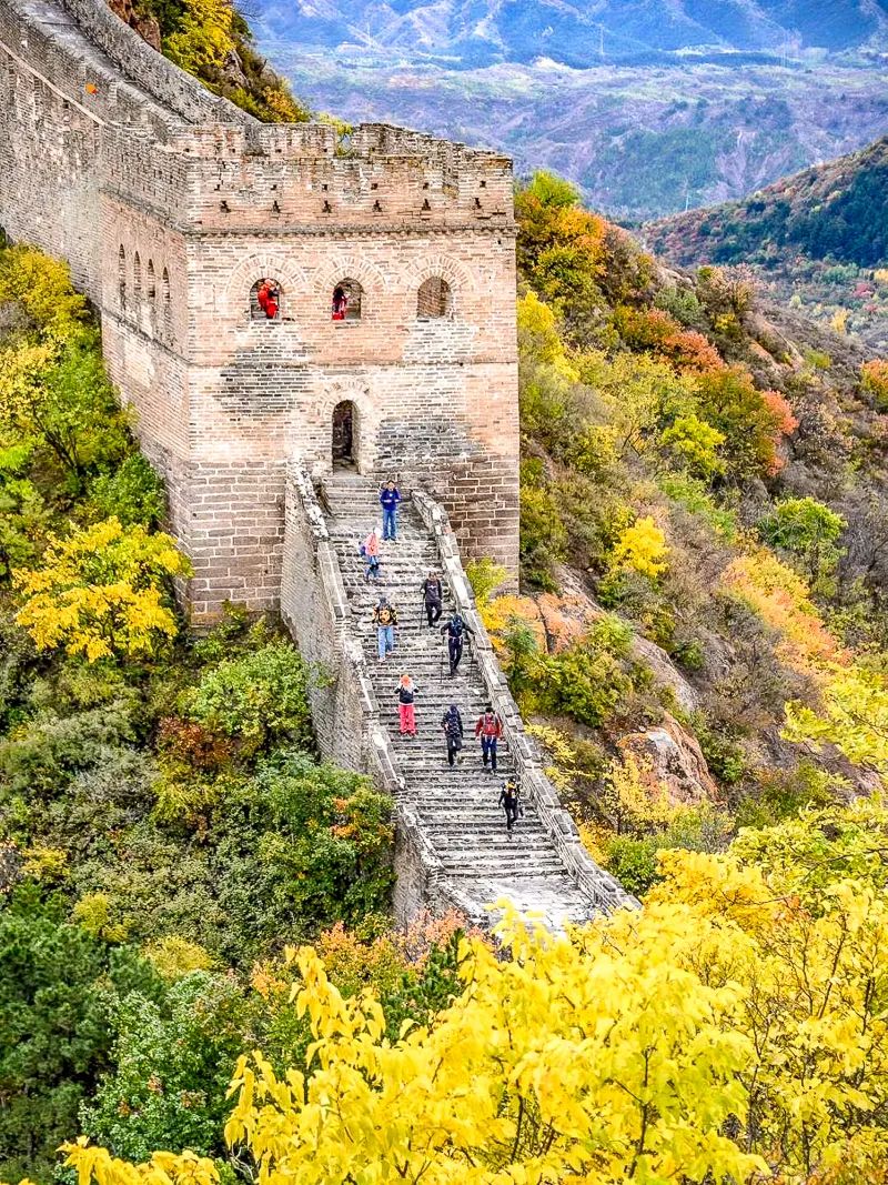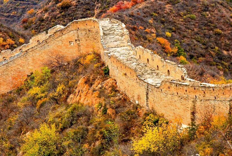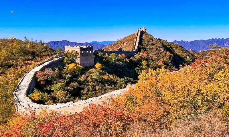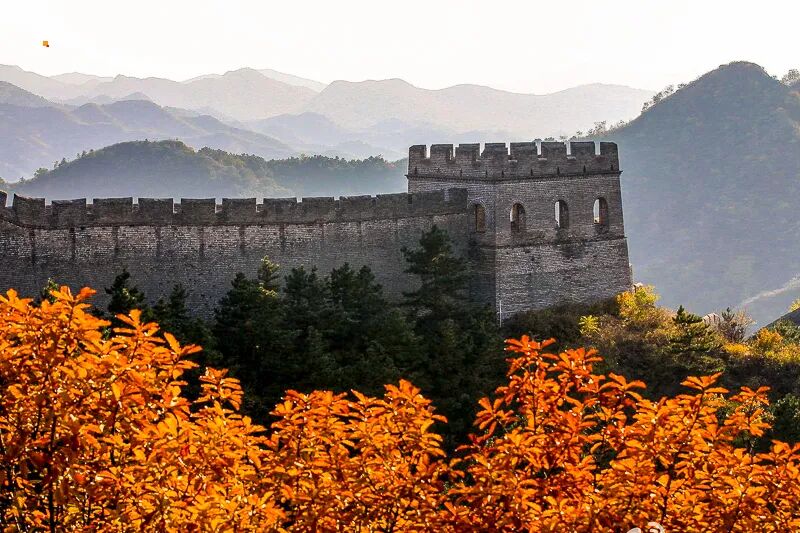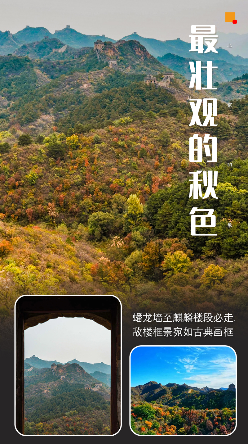 金山岭长城位于河北省承德市滦平县境内,与北京市密云县相邻,由明朝爱国将领戚继光担任蓟镇总兵官时期(1569年-1582年)主持修筑,是万里长城的精华地段。西起龙峪口,东至望京楼,全长10.5公里,沿线遍布关隘、敌楼、烽火台。站在将军楼、大小金山楼等高点远望,目光所及的巍巍群山之巅皆有长城蜿蜒,非常壮观。央视每天早上播出的《国歌》中的长城画面就取景于此。每年十月中旬到十一月上旬,漫山遍野的黄栌、枫叶、火炬树等开始变幻出红的、黄的、橙的颜色,为古老的长城添上一抹秋日斑斓。