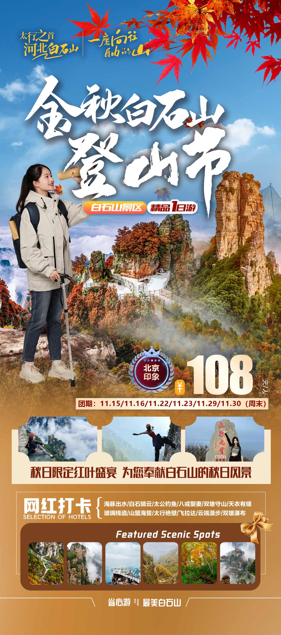 - 11:00|到达白石山景区,大家乘坐缆车到达山顶,在云端赏太行之首美景,看奇山怪石,中午云间午餐时间,尽情享受;下午继续欣赏美景,喜欢摄影的尽情创作,三步一景,五步成诗,十步入画,百步不胜在人间。