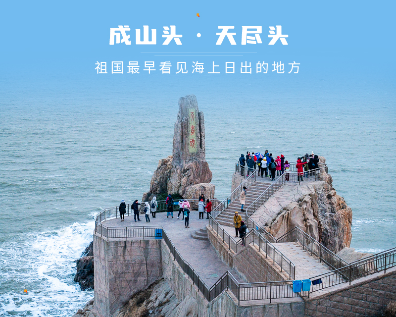 成山头又名“天尽头”,三面环海,一面接陆,与韩国隔海相望,因地处成山山脉最东端而得名。曾被《中国国家地理》评为“中国最美的八大海岸”之一,自古就被誉为“太阳启升的地方”。是最早看见海上日出的地方,与海南三亚的亚龙湾、台湾基隆的野柳一起名列三甲。