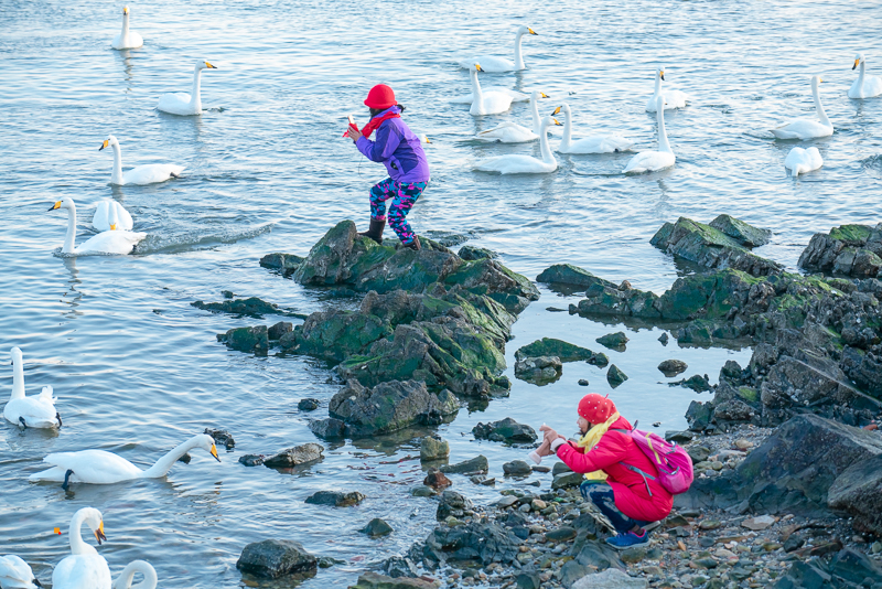 烟墩角离海面很近,仅有几十米远,退潮时还可以去海滩边、礁石上,与天鹅零距离接触,十分方便观赏和拍摄。这里的天鹅全然不惧怕近在咫尺的人们,或静浮水面,或结伴游弋,或嬉戏打闹,或振翅飞翔,俨然一幅人与动物融洽相处的和谐画卷。