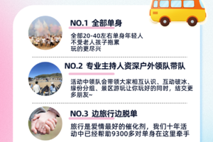 - 缘分是奇妙的引线,按缘分值分配座位,男女相邻而坐,开启初遇的心跳。专业领队化身“破冰大师”,组织大家在大巴上进行自我介绍,让初次见面的尴尬瞬间消散。请严格按照集合信息准时出发。