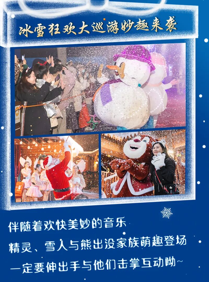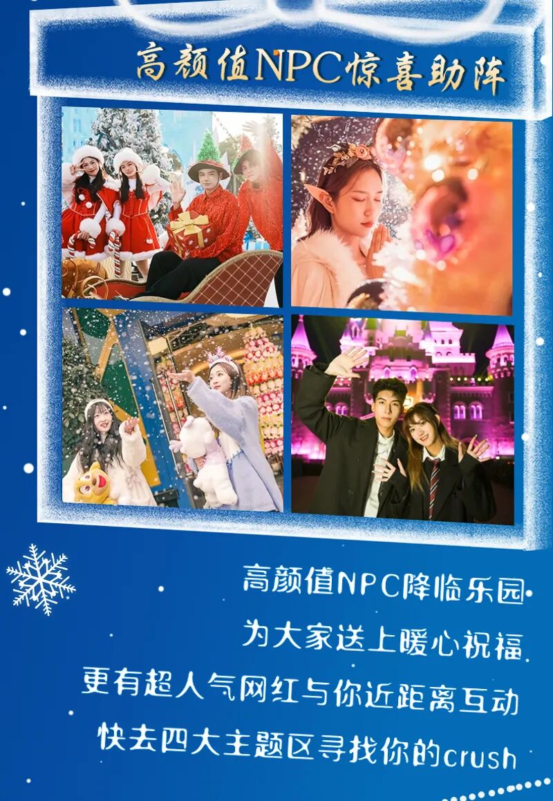 高颜值NPC惊喜助阵,高颜值NPC降临乐园为大家送上暖心祝福更有超人气网红与你近距离互动快去四大主题区寻找你的crush。冰雪狂欢大巡游妙趣来,伴随着欢快美妙的音乐,精灵、雪人与熊出没家族萌趣登场定要伸出手与他们击掌互动呦。室内项目”白+黑"尽情畅玩,室内高科技项目"白加黑"超长待机体验主题活动、畅玩王牌项目愿你在乐园创造更多欢乐回忆。