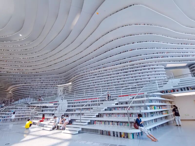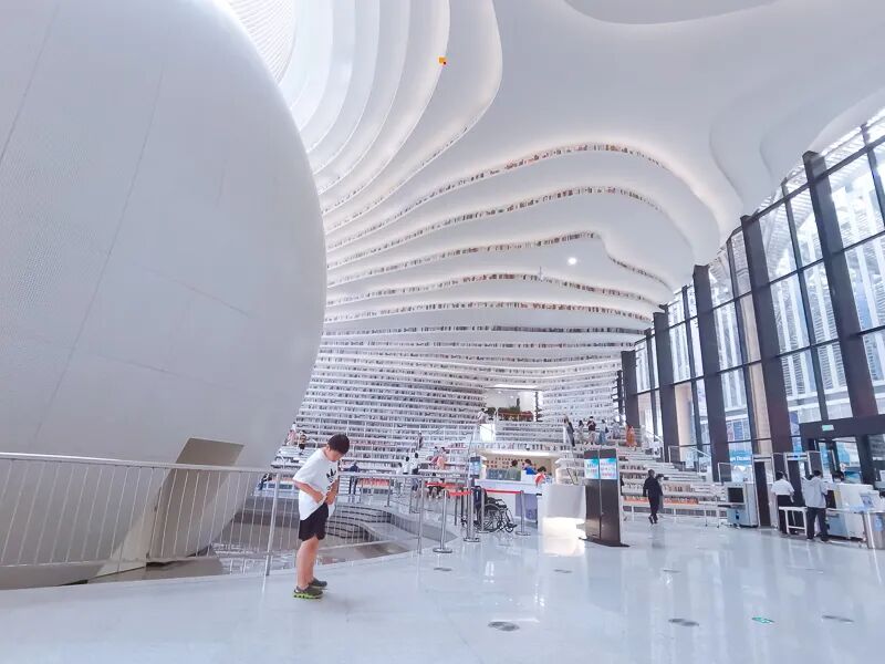 滨海图书馆被评为世界最美图书馆、网红图书馆。图书馆是由荷兰MVRDV建筑设计事务所与天津市城市规划设计研究院建筑分院合作设计,设计立意“滨海之眼”和“书山有路勤为径”,建筑面积33700平方米。