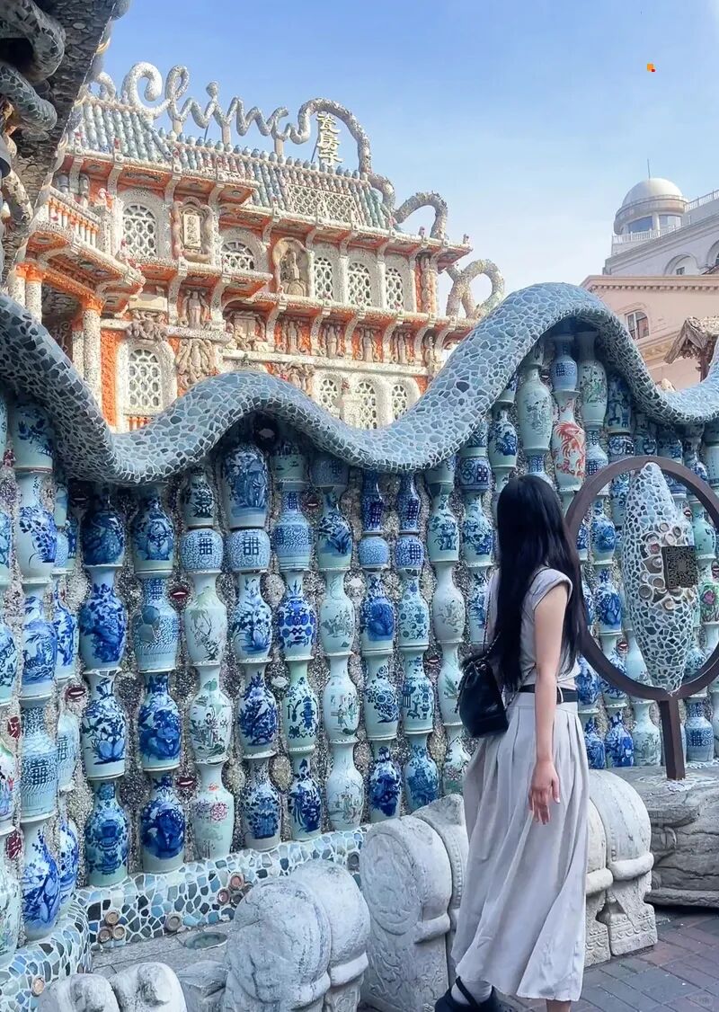 外观价值60多亿元人民币、由五十吨水晶、几十万片五大窑古瓷片,历时5年修建的中国古瓷博物馆【瓷房子]。外观【瓷房子】,瓷房子整个楼房修建一共用了7亿多片古瓷片,13000多件古瓷瓶、瓷盘、瓷碗,300多尊历代的石雕造像,300多件汉白玉石狮子,300多个明清时期的瓷猫枕,20多吨的水晶玛瑙等,它被称为一座价值连城的“中国古瓷博物馆”。