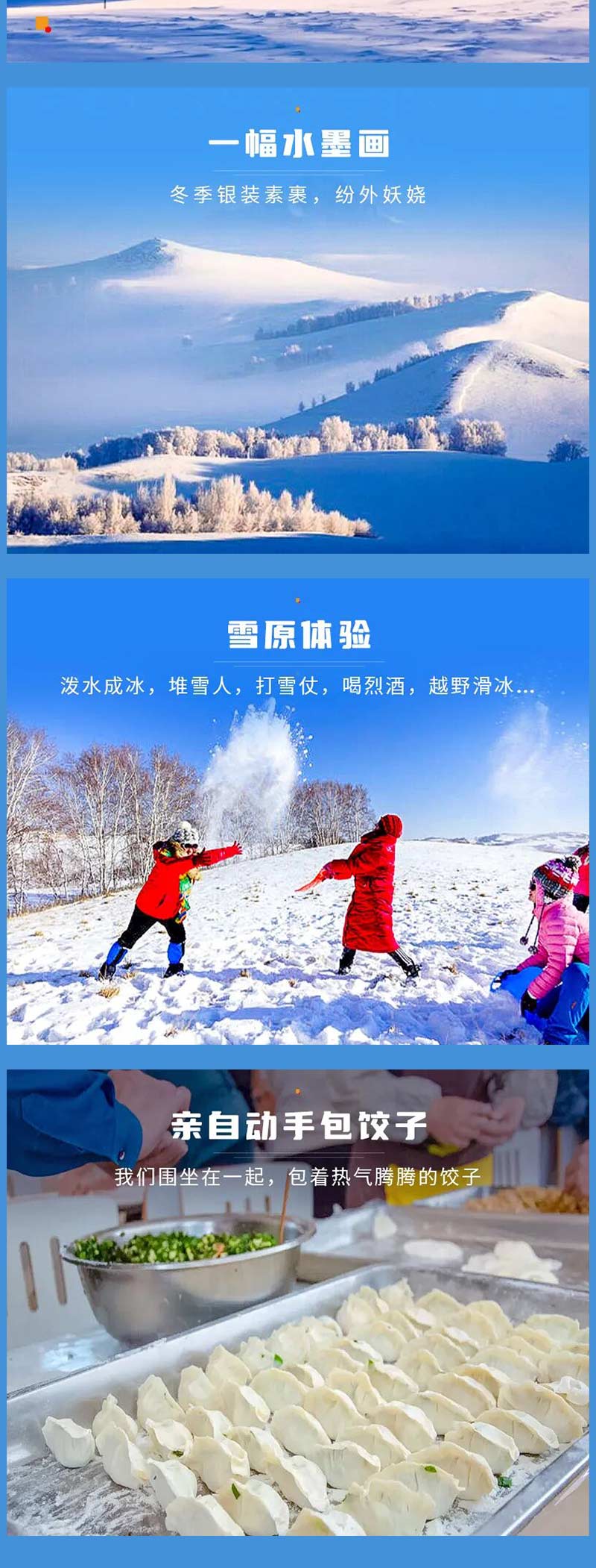 4)冰雪娱乐,堆雪人,打雪仗,雪地拔河,老少皆宜!