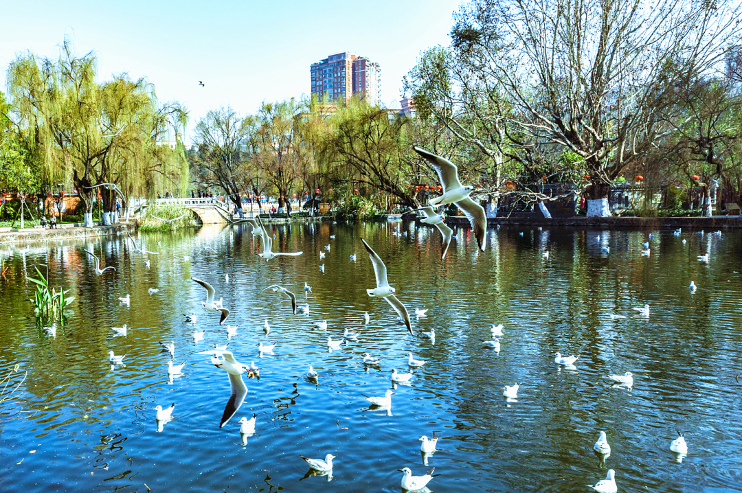 4、滇池海埂大坝,观景长廊,以开阔的湖景、壮观的红嘴鸥群和西山“睡美人”山景闻名,每年11月至次年3月,是最佳观海鸥胜地。