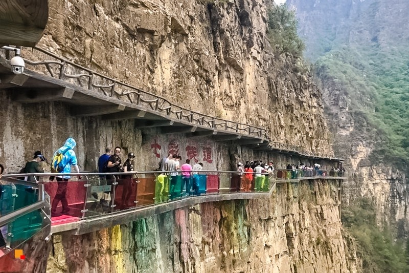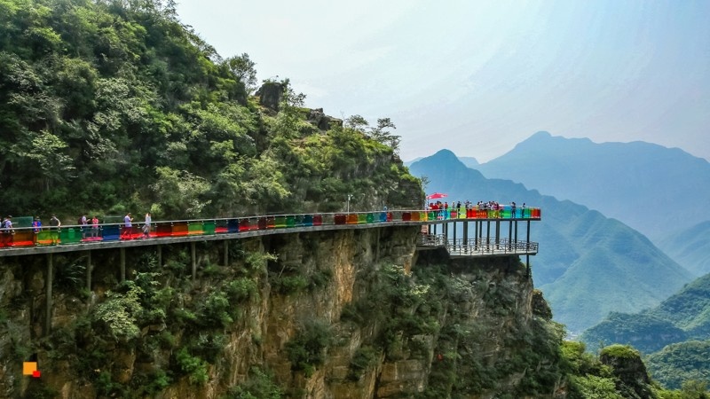 七彩玻璃栈道:环翠屏峰倚峭而建,全长369米,高差600余米,由玻璃栈道、七彩玻璃栈道、全景玻璃平台、特效玻璃栈道组成,犹如一道彩虹桥通向云端,在云雾中若隐如现,行走之上如云中漫步,置身于仙境。