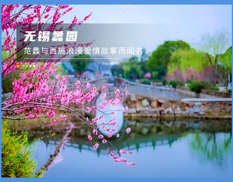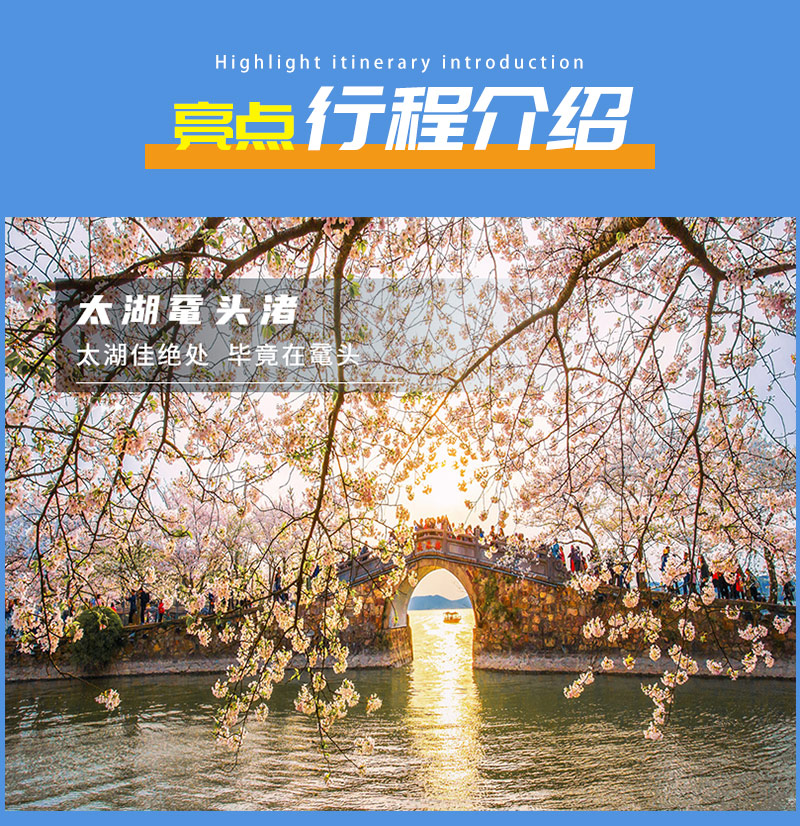 - 上午我们集合前往鼋头渚游览,这里被人称为“中华第一赏樱胜地”,我们可以坐游船游览这太湖西岸的美景,也可以在花海中漫步,看鼋头渚牌坊、看长春花漪、海峡友好石碑...每年的清明前后,这里的万千樱花竞相开放,春风微抚,樱花瓣漫天飞舞,给人一种进入漫画中的错觉。美女们可以穿些古装,或者带着粉嫩色系的丝巾进去拍照,一定很美。