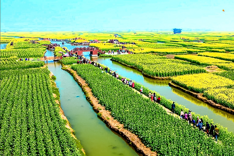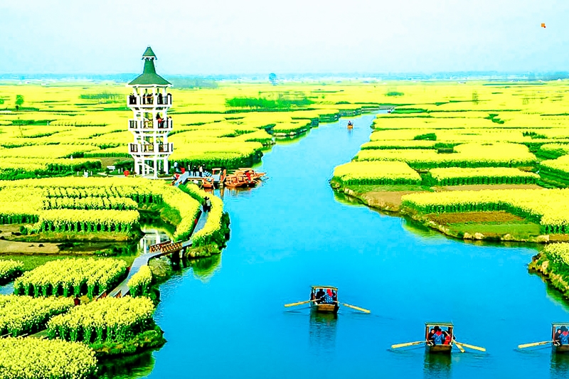 我们坐在画舫船上欣赏千亩跺田油菜花田,以“垛田”特色地貌享誉全球,块块隔垛宛如漂浮于水面岛屿,有“万岛之国”的美誉。每到春季,金黄色的油菜花盛开于垛田之上,可登上景区内的亭台楼榭上俯视整片花海。中午可在景区附近就餐,品尝当地的溱潼八鲜特色美食。