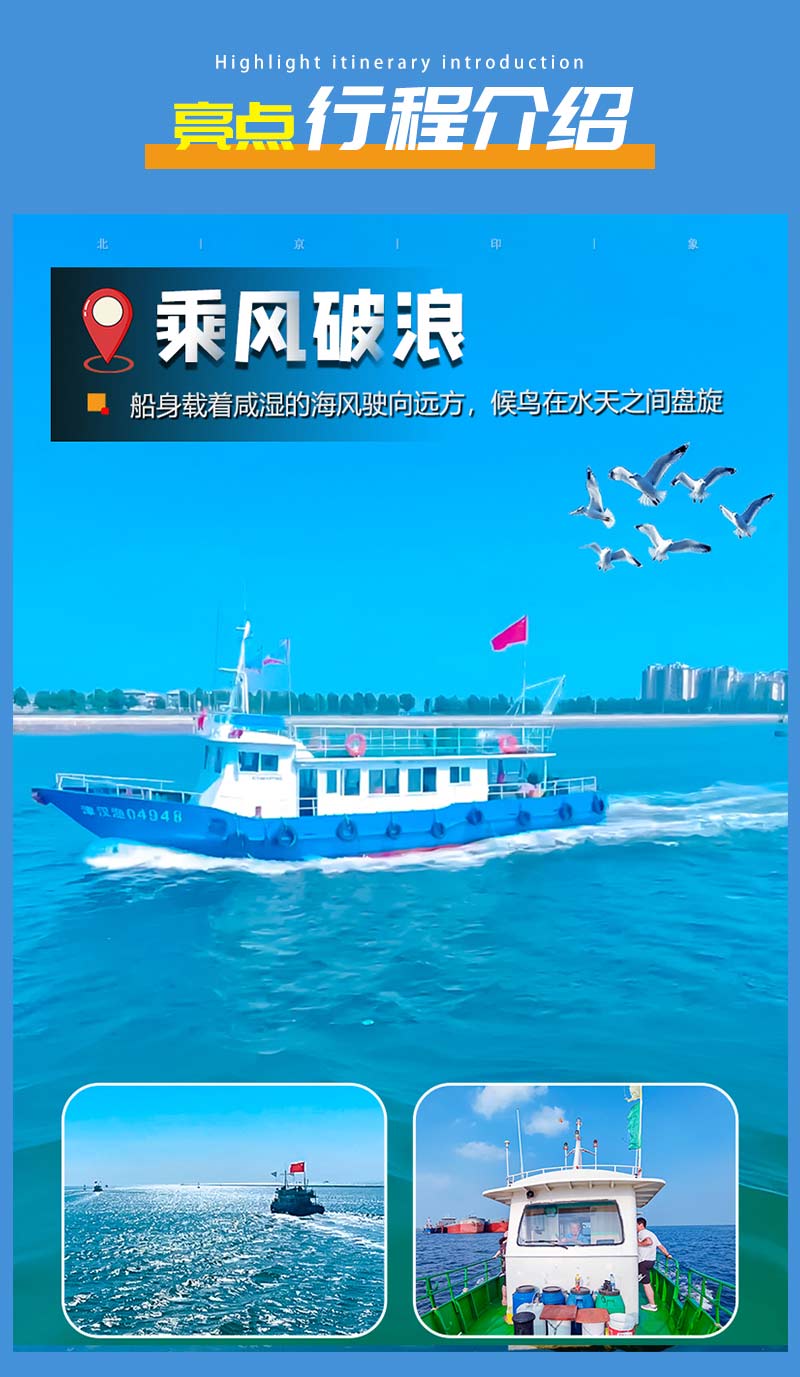 蔚蓝的海面上,成群的海鸥展翅翱翔,伴随着渔船破浪前行,构成一幅动人的海上画卷。扬帆起航,乘风破浪!远离城市的喧嚣,投入大海的怀抱,体验一次难忘的出海打渔之旅!