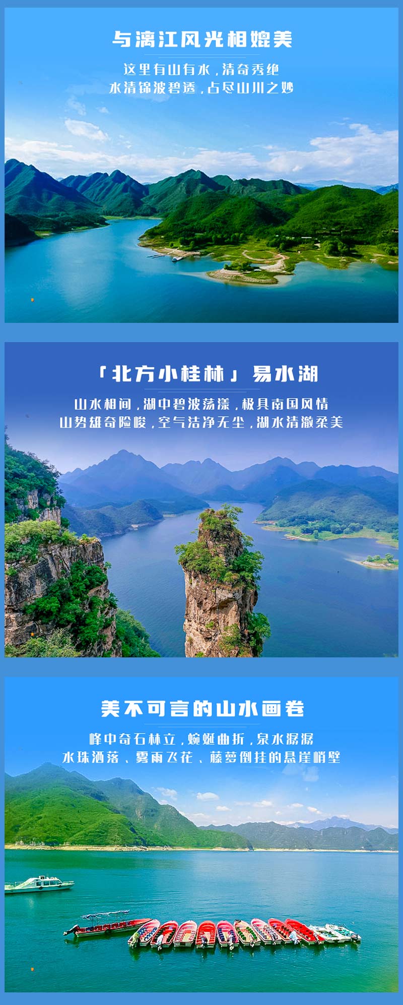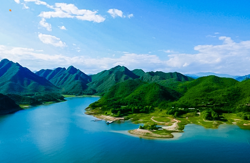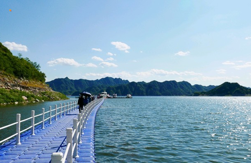 我们到达易水湖码头,一起坐船到湖中心去上高山栈道观看全景,逛长空栈道——赤壁拍摄外景地。易水湖风景区因可与漓江风光相媲美,故而被誉为“北方小桂林”。易水湖是利用四周高耸的山势而修建的一座人工湖,周围环境优美,清澈纯净,景色宜人。藤萝倒挂的悬崖峭壁,勾划出南国风光的桂林山水画,并且留下了七仙度国舅的美丽传说,可谓是欲知桂林风景,何必千里下江南。