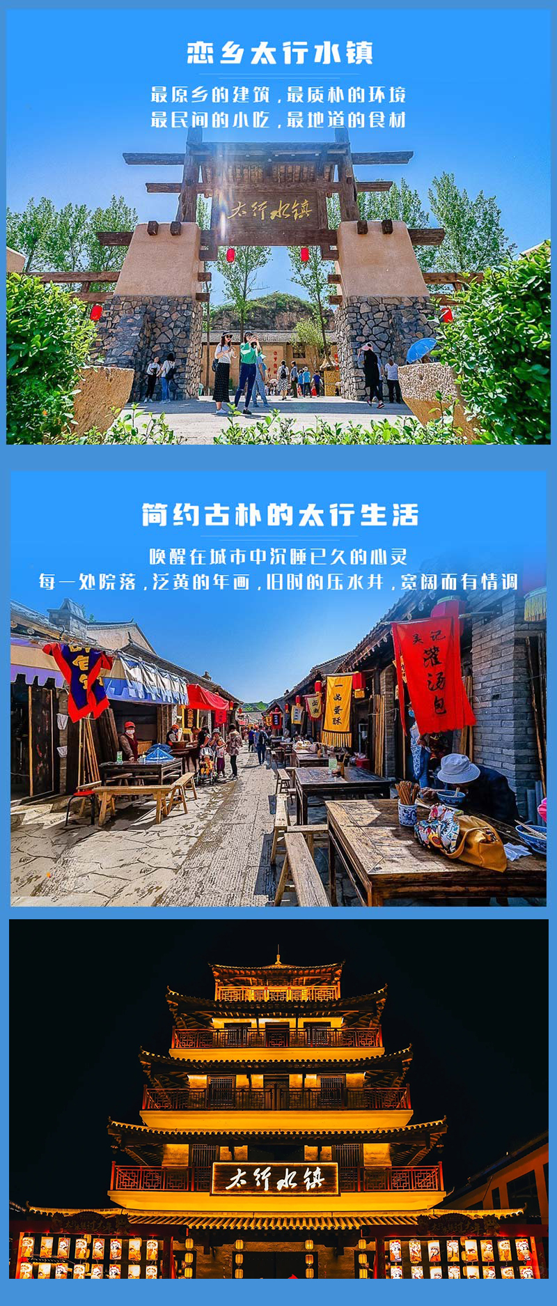 - 适时乘船返回码头后,我们前往『太行水镇』,大家自由结伴游览品小吃、逛夜景(节假日还有可能有精彩的表演,具体以景区实际安排为准)。
