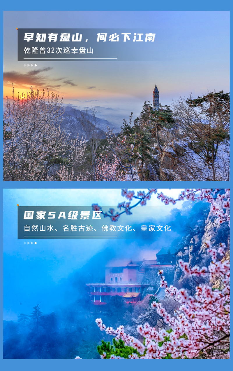 您可选择徒步游览盘山精华赏花线路,也可乘坐缆车盘山全景游。盘山雄踞于北京之东,有“京东第一山”美誉,是国家重点风景名胜区。盘山风景区集幽林,古洞,奇峰,秀水于一身,开放了五大景区,一百三十余处景点。开通了盘山、云松、挂月三条客运索道,游人乘过索道可直达盘山绝顶挂月峰。盘山既是风景佳境,又是佛教圣地。佛塔、僧骨塔达百余座。这些寺庙、佛塔有的至今尚在,成了人们游览的名胜古迹。