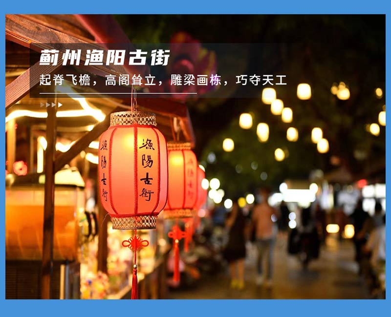 - 下午|适时集合我们前往酒店安排住宿,晚上大家由自前往蓟州渔阳古街,可在此自由品尝各种特色美食。(如住宿离蓟州城区较远,则改为先游览渔阳古街)