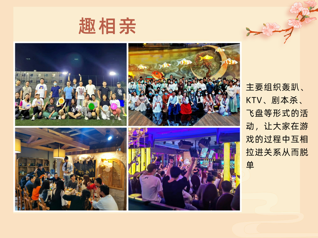 初相识、缘份分组:根据男女比例缘份分组男女搭配,领队带领大家互相认识