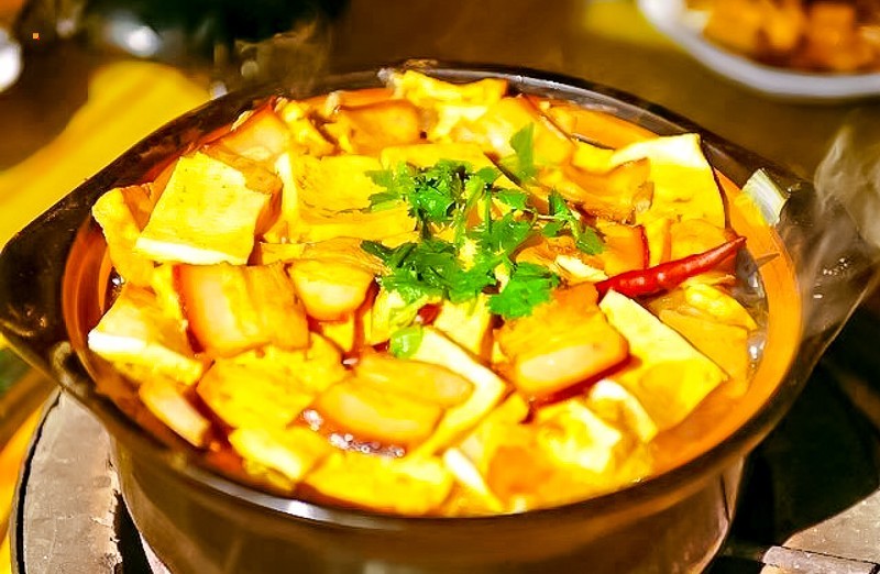 在传统火盆锅的基础上,对豆腐进行开发,做出美容养颜的黄豆豆腐、滋补养肾的黑豆豆腐、清热袪火的绿豆豆腐。制作时以一主锅为主,放入五花熏肉、白菜、鲜豆腐、冻豆腐、炸豆腐等。
